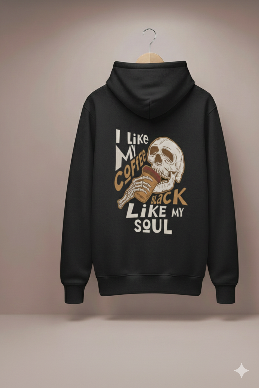 A humorous, gothic black hoodie featuring a skeleton hand holding a coffee cup next to a grinning skull. The graphic is surrounded by text that reads, "I Like My COFFEE BLACK Like My SOUL," making it perfect for coffee lovers with a dark sense of humor.