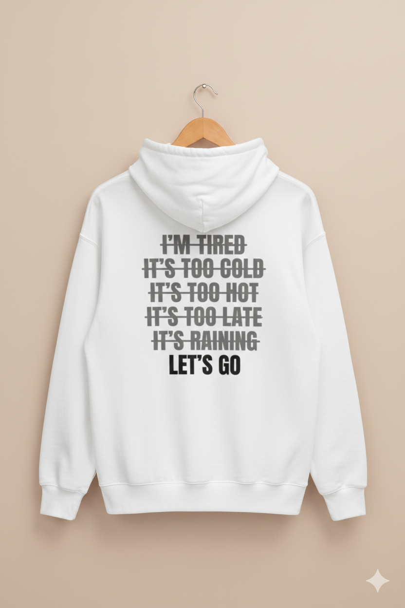 A motivational white hoodie featuring stacked, black text on the back. Multiple common excuses like "I'M TIRED," "IT'S TOO COLD," and "IT'S TOO LATE" are crossed out with a gray line. The final, bold line states "LET'S GO," making it an ideal piece for overcoming inertia and starting a workout.