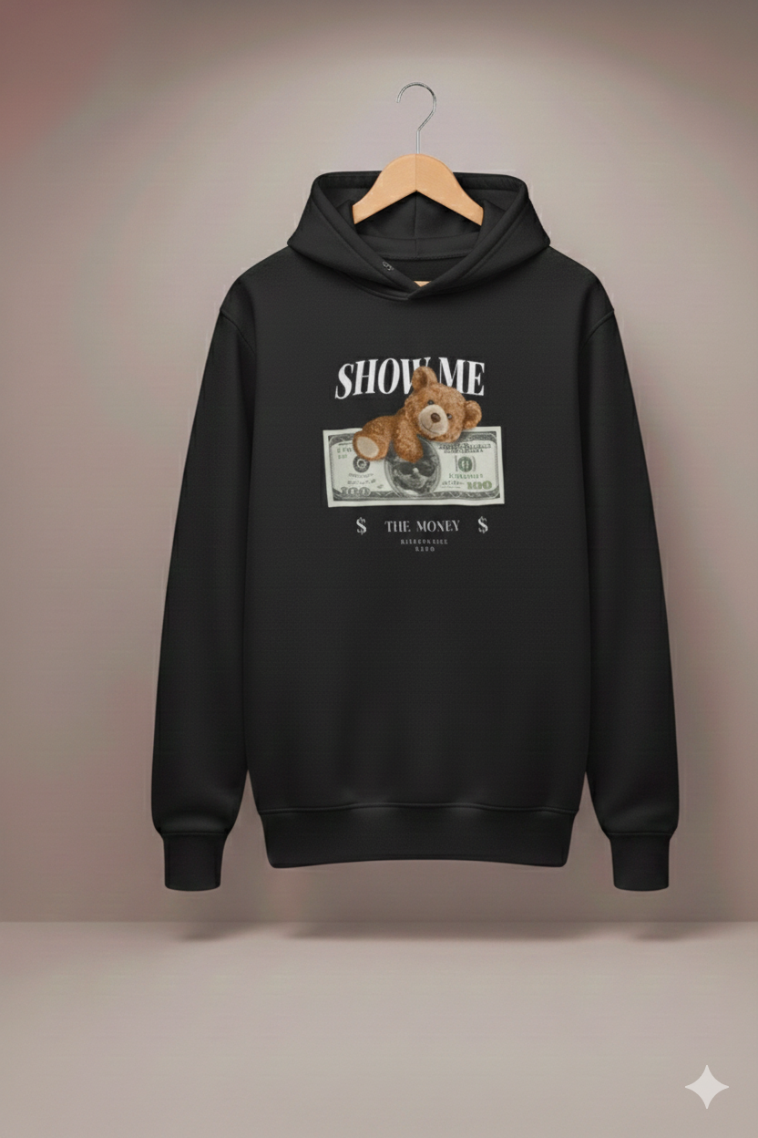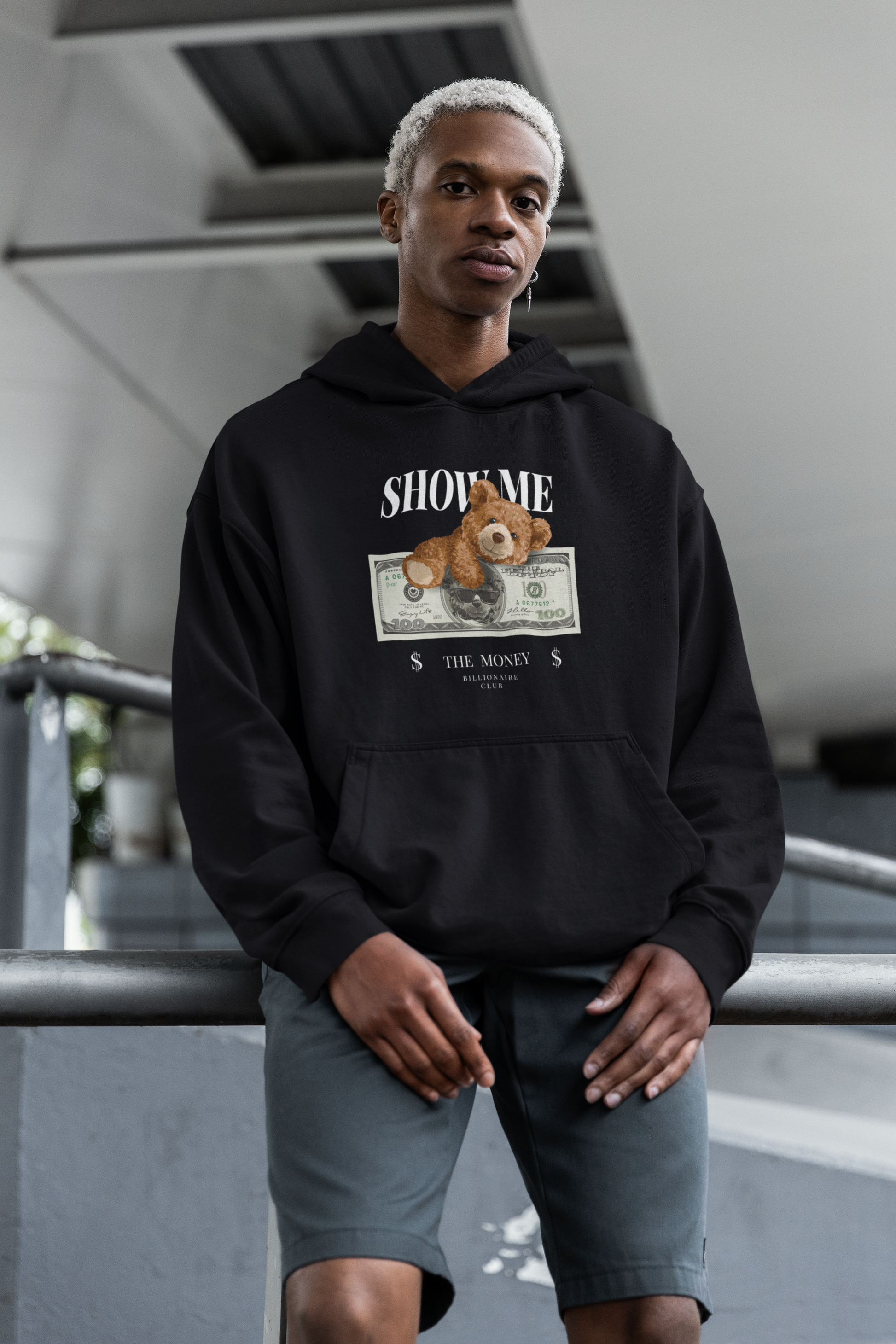 A stylish black hoodie with a central, striking graphic on the chest. It features a small teddy bear resting on a rolled-up $100 bill. The text above states "SHOW ME" and the text below adds "THE MONEY," creating a bold statement on wealth and capitalism.