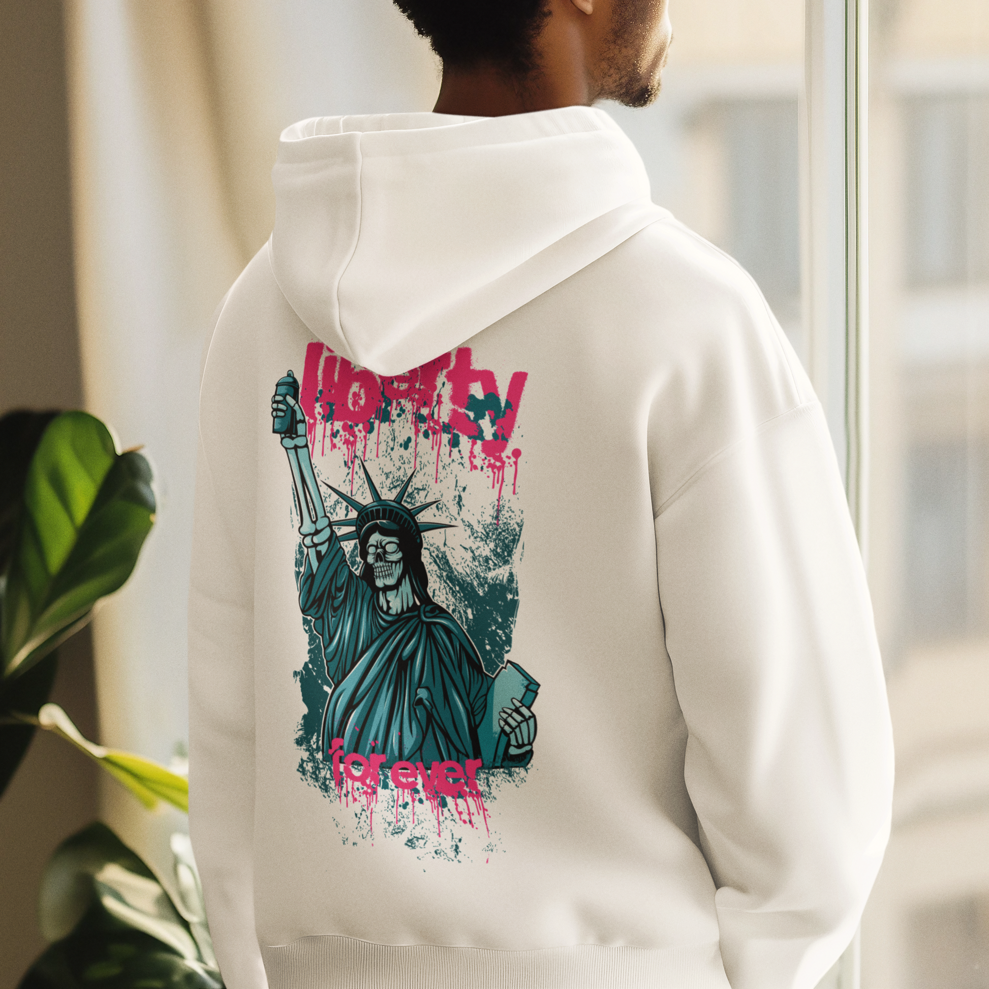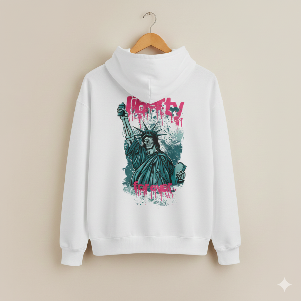 An arresting white hoodie displaying a punk-rock interpretation of the Statue of Liberty as a skull figure holding a spray can. Done in a grungy teal and pink splatter style, it's captioned with "Liberty FOREVER" and offers a rebellious, artistic take on a classic icon.